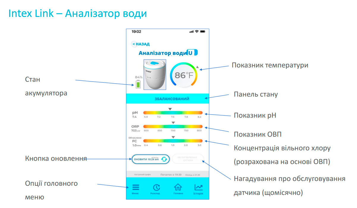 Прибор автоматически измеряет pH и ORP (окислительно-восстановительный потенциал — показатель, напрямую отражающий эффективность хлорирования). Замеры выполняются каждый час, поэтому вы всегда получаете актуальные данные в реальном времени. Вся информация передаётся в мобильное приложение Intex Link App, где отображаются отчёты о состоянии воды и рекомендации по её корректировке.