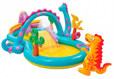 горка, фонтан, надувной динозавр, кольца и шарики
